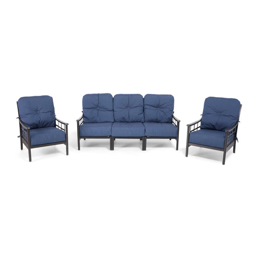 Experience ultimate comfort with the Newport Grey 5 Piece Loveseat Group in Spectrum Indigo. Crafted with durable aluminum frames and topped with p...