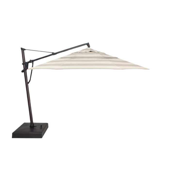 Enjoy a elegant outdoor shade experience with the 13' Designer Octagon AKZ+ Infinite Tilt Cantilever Umbrella. The New Block Smoke Stripe Sunbrella® Fabric includes a 5 Year Color Fading Warranty. The sturdy, 400 lbs. Cantilever Base comfortably supports the Cantilever, while also allowing for additional weight on necessary days. Upgrade to a rolling base to ease any needed rearrangement. With full rotation and tilt capabilities, and a shade coverage of 129 square feet, this Cantilever is the perfect, stylish upgrade for any space. This Cantilever also includes a protective cover, ensuring your product will last.