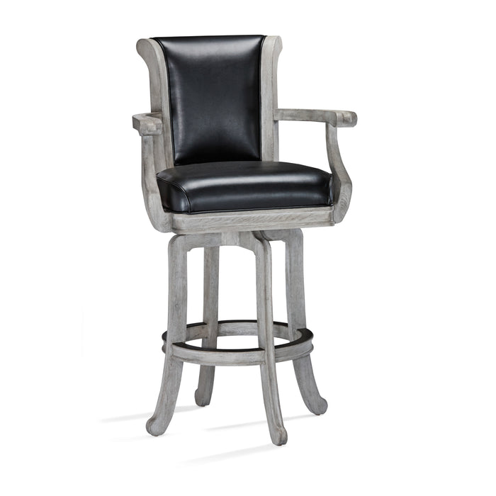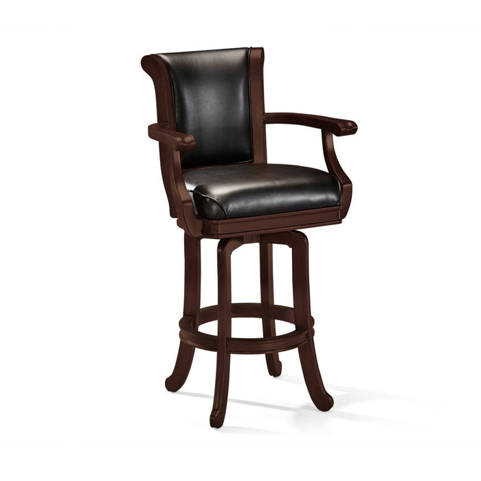 The Centennial Barstool features a traditional design, with rounded arm rests designed for hand comfort and seat/seat back made of bonded leather. With its 360 degree swivel and black metal kick plate, the Classic Centennial Bar stool from Brunswick is the perfect addition to any space.