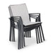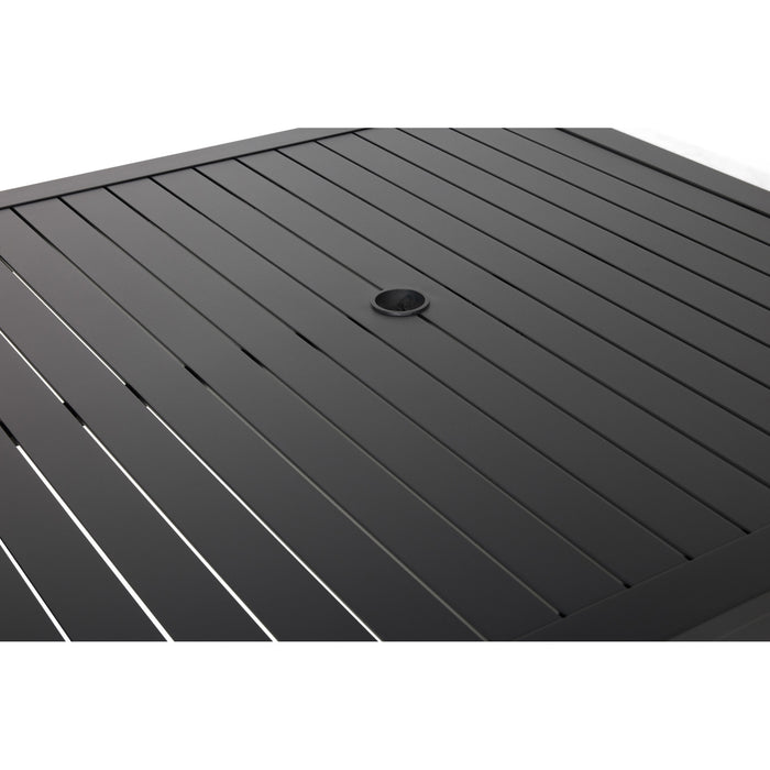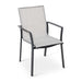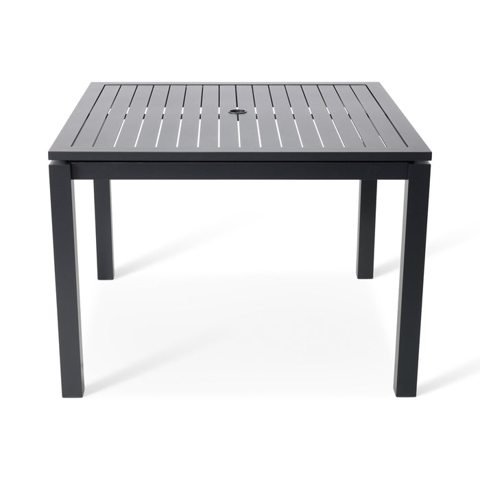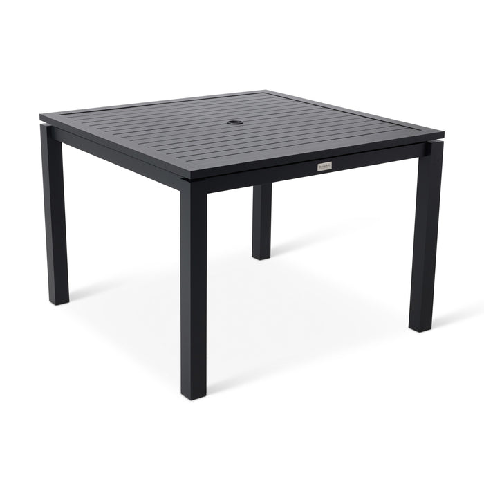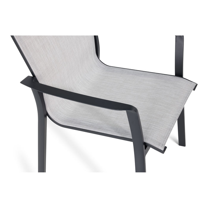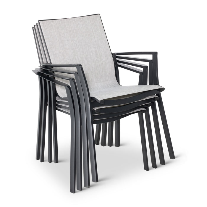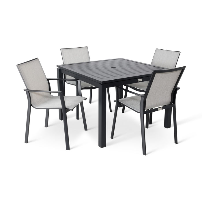 The Mila 5 Piece Sling Dining Group offers both style and versatility with a sleek Matte Black frame and Grey sling. This set includes four stacking dining arm chairs and a 42" square aluminum table for a complete outdoor dining experience. Upgrade your patio with this timeless and durable dining group.