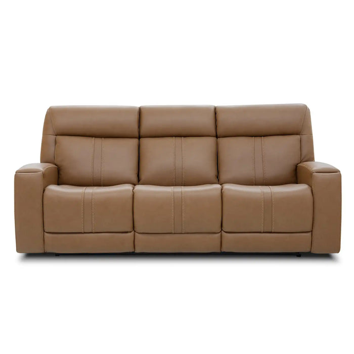 Experience ultimate comfort and relaxation with the Nova Butternut Sofa. Made with top grain leather in a sleek Butternut color, this sofa features immersive audio and triple power recline technology with adjustable headrest and lumbar massage and heat for a truly luxurious seating experience. Perfect for any living room or home theater. Featured at the lowest "Cash Price" available. Contact a salesperson for special financing options available in-store.