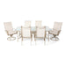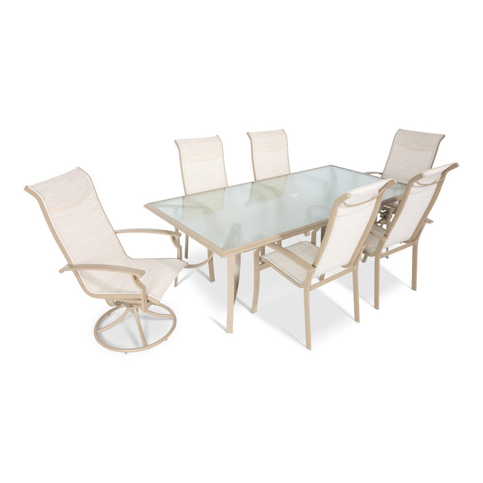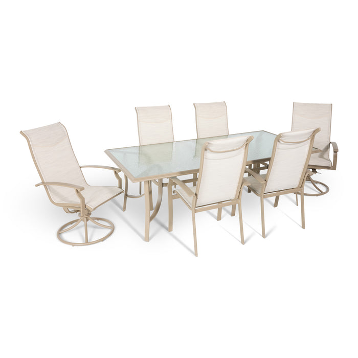 Elevate your outdoor dining experience with the Solana 7 Piece Dining Group. The taupe frame and light beige sling offer durability and style, while the two high back sling swivel rockers and four stacking dining chairs provide comfort and support. The 42" x 84" rectangle tempered glass dining table completes the set, making it perfect for entertaining.