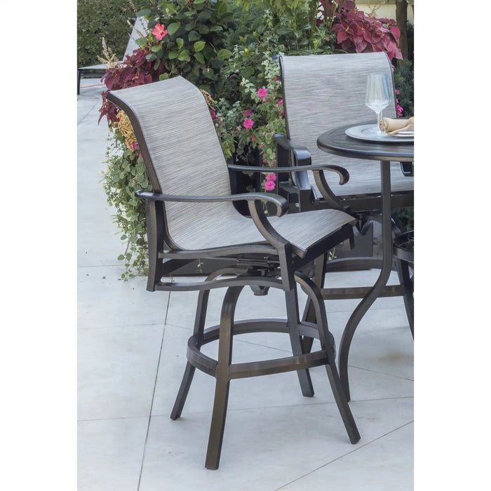 The superb Stirling Sling Bar Collection puts a contemporary spin on a traditional design, incorporating the perfect balance of detail and simplicity. -- The swivel barstools offer a higher back with a contour sling, striking the perfect balance between low maintenance and comfort. The powder coated aluminum frame along with a thicker layer of coating will shield this investment for years to come.