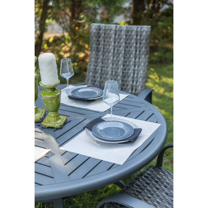 The Wakefield 5 Piece Woven Dining Group brings modern style and practical comfort to your outdoor entertaining space. Featuring a sleek powder-coated aluminum frame paired with quick-drying woven bucket seating, this collection delivers contemporary design without the upkeep. Choose from multiple sizes and fabric options to perfectly match your aesthetic and space requirements. The ergonomic contoured seats provide excellent support, while the weather-resistant construction means you'll spend less time maintaining and more time enjoying gatherings with family and friends.
